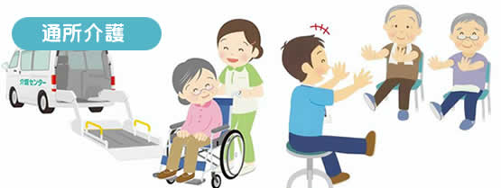 | 1日の流れ | ☆送迎車両によりご自宅までお迎えにまいります。 ☆施設に着くと看護職員により体調チェックを行ないます。 ☆その後は入浴と食事、午後は機能訓練・レクリエーション等を行います。 |