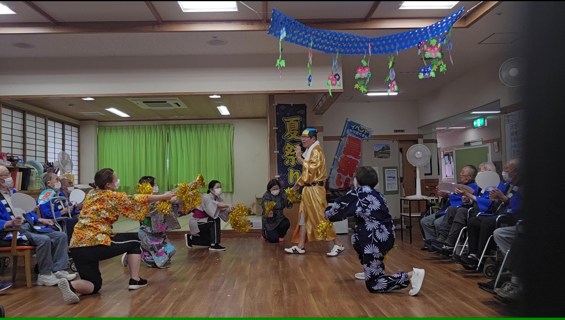 今年も夏祭りの季節がやってきました!年々暑さが厳しくなってきていますが、涼しい室内でお祭りを行いました!今年はいつもと違い、施設長が歌ったり、デイの職員がマツケンサンバを披露したり、お米すくいではなくお米釣りをしたり、楽しい夏祭りになりました☆